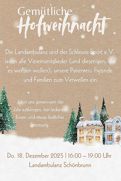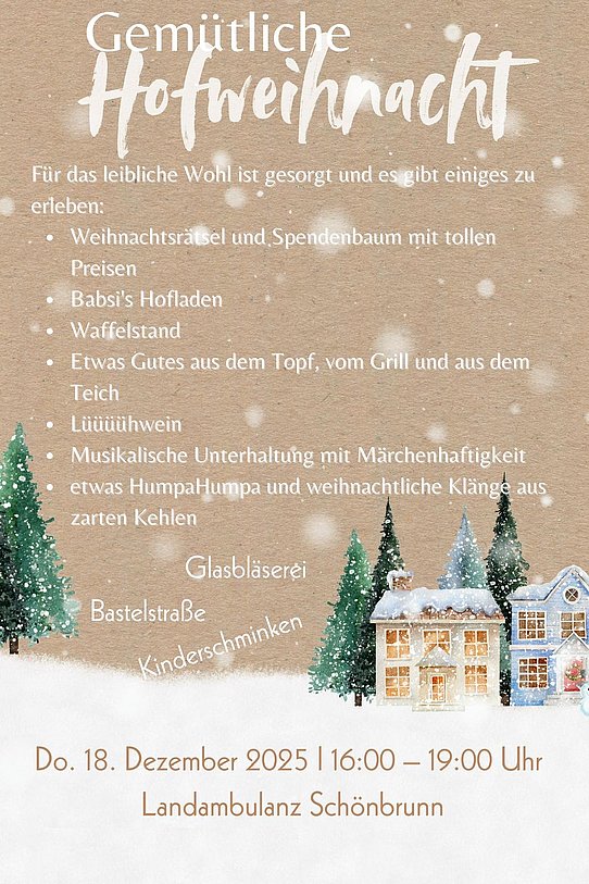 Am Donnerstag, den 18.12., findet aufgrund unserer Mitwirkung am gemeinnützigen Weihnachtsmarkt der Landambulanz Schönbrunn keine ärztliche Sprechstunde am Nachmittag statt. Wer kurzfristig Zeit und Lust auf einen Besuch hat, ist herzlich eingeladen.